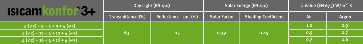 Trakya Cam has developed an exclusive product Isıcam Konfor 3+ especially dedicated to effective energy saving which combine thermal insulation performances of triple glazing units incorporating one pane of Solar Low-E heat and solar control coated glass (Şişecam Solar Control Low E) and one pane of Low-E heat control coated glass (Şişecam Low E Glass) with two cavities.